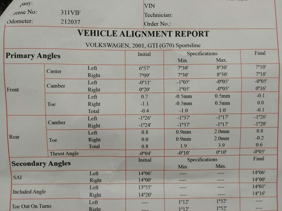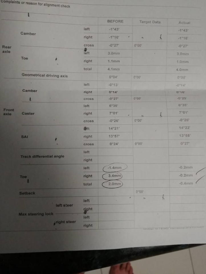 I had some new tyres fitted today and had a basic wheel alignment performed. What I noticed immediately was how uneven the wheel camber, castor and toe was.