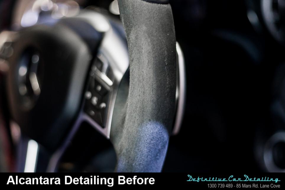 Alcantara on the steering wheel have also been covered by silicone dressing, plus grease and whatnot from the driver's hands. The fibres were flat & felt disgusting. Alcantara was detailed using an alcantara specific cleaner & brush from the Furniture Clinic UK.