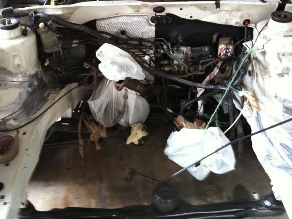 Engine bay ready for the panelbeaters, ghetto styles