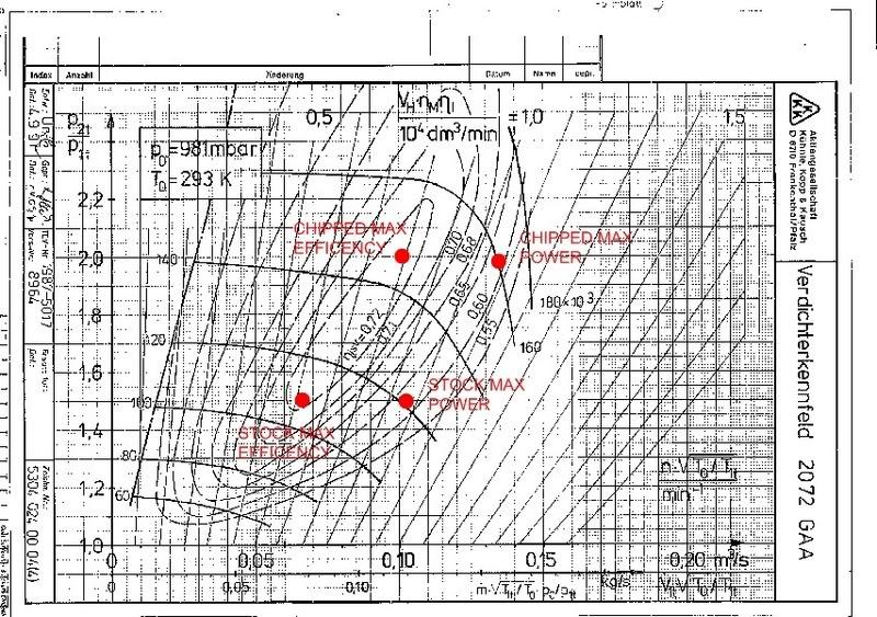 On a chipped car note that efficency of the K03 is the same for that at stock boost... this is why the stock intercooling system still works fine with the car in a chipped state... it is no less efficent and produces no more heat Also, the efficency band is moved higher in the rev range... where previously boost is starting to fall off it stays strong - hence the increse midrange poke of a chipped polo everyone raves about!!! And of course we all know the more air we flow the more power we can make...